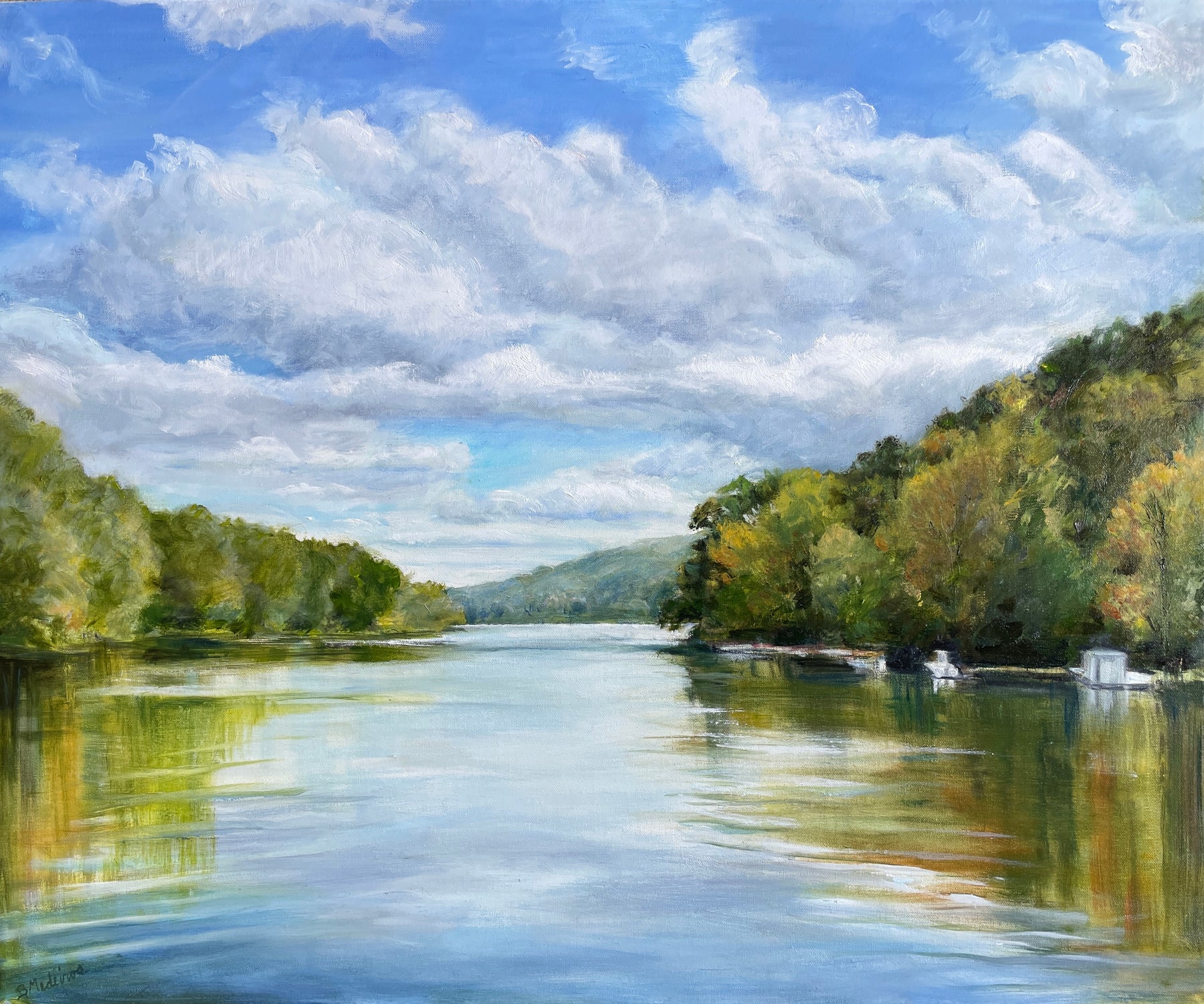 Just painted while it is the beginning of fall, when the leaves are just starting to change and the light begins to soften. The clouds are drifting and they cast reflections, a little movement in an otherwise calm scene.